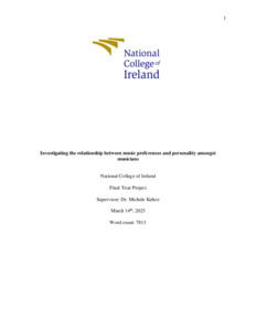Chan, Tin Ho Skye (2025) Investigating the relationship between music preferences and personality amongst musicians. Undergraduate thesis, Dublin, National College of Ireland.