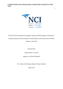 Farij, Oumaima (2025) What are the lived experiences and adaptive strategies of Muslim diaspora communities in navigating cultural and social integration, transnationalism, and the preservation of Islamic traditions in the West? Undergraduate thesis, Dublin, National College of Ireland.