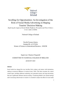Fonseca Santos, Nicolle (2025) Scrolling for Opportunities: An Investigation of the Role of Social Media Advertising in Shaping Tourists’ Decision-Making: Exploring the impact of Social Media Platforms Perception and Travel Choice: A case study in Dublin. Masters thesis, Dublin, National College of Ireland.