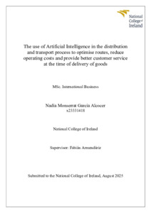 García Alcocer, Nadia Monserrat (2025) The use of Artificial Intelligence in the distribution and transport process to optimise routes, reduce operating costs and provide better customer service at the time of delivery of goods. Masters thesis, Dublin, National College of Ireland.