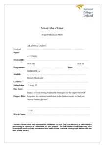 Yadav, Akansha (2025) Impact of Considering Sustainable Strategies on the improvement of Logistics for customer satisfaction in the fashion sector. A Study on Native Denims, Ireland. Masters thesis, Dublin, National College of Ireland.