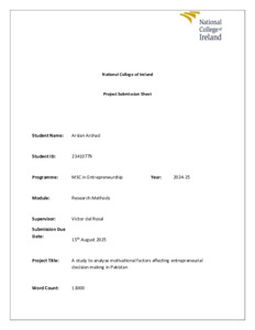 Arshad, Arslan (2025) A study to analyse motivational factors affecting entrepreneurial decision making in Pakistan. Masters thesis, Dublin, National College of Ireland.