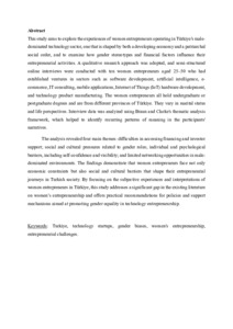 This study aims to explore the experiences of women entrepreneurs operating in Türkiye's male-dominated technology sector, one that is shaped by both a developing economy and a patriarchal social order, and to examine how gender stereotypes and financial factors influence their entrepreneurial activities. A qualitative research approach was adopted, and semi-structured online interviews were conducted with ten women entrepreneurs aged 25–50 who had established ventures in sectors such as software development, artificial intelligence, ecommerce, IT consulting, mobile applications, Internet of Things (IoT) hardware development, and technology product manufacturing. The women entrepreneurs all hold undergraduate or postgraduate degrees and are from different provinces of Türkiye. They vary in marital status and life perspectives. Interview data was analyzed using Braun and Clarke's thematic analysis framework, which helped to identify recurring patterns of meaning in the participants' narratives.