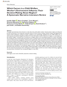 Gibbs, Jennifer, Coughlan, Barry, Morgan, Tessa, Mikushnica, Arbenita, Phippard, Samantha, Crozier-Roche, Francesca, Drayak, Taliah, Graham, David, Smith, Jack and Duschinsky, Robbie (2025) Which Factors in a Child Welfare Worker’s Environment Influence Their Decision-Making About Neglect? A Systematic Narrative Literature Review. Trauma, Violence, & Abuse. ISSN 1552-8324